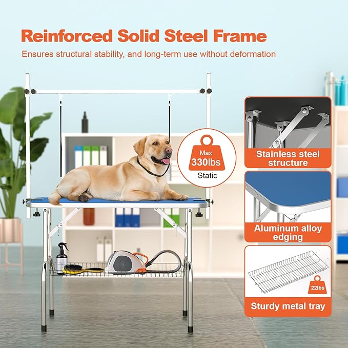 46'' Modern Blue Dog Grooming Table, Foldable Professional Grooming Table for Large Dogs, Up to 330lbs, Stainless Steel