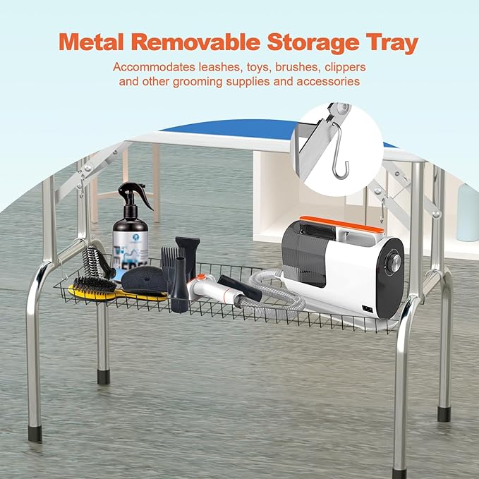 - Thoughtful Details: Premium non-slip and waterproof silicone countertop brings a soft and gentle touch to pet paws and grants a hassle-free pet hair cleaning experience; The rounded table edges and dual leash design avoid pets undesired damage or injury; The reinforced storage shelf accommodates leashes, toys, brushes, clippers, and other grooming supplies and accessories
