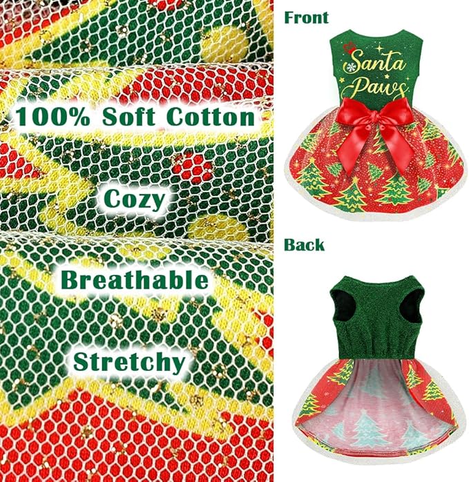 - Eye-Catching Design: Cute christmas girl style, printed with many elements like santa claus, christmas tree etc. This christmas dog clothes is also decorated with cute green,red or gold bow tie to enhance the cuteness of your pet. Perfect for the upcoming Christmas , cosplay parties, Christmas girl costumes, NewYear and more