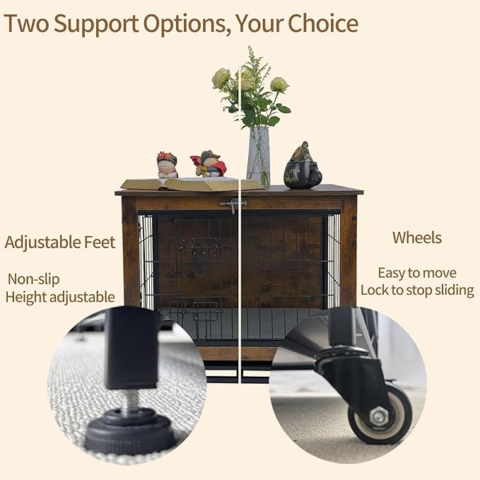 - 360Β° πΎπππππ ππ π¨π ππππππππ ππππ: This versatile wooden dog crate offers two installation options: 360Β° rotating wheels for easy movement, complete with locks to secure it in place, or adjustable feet to accommodate uneven surfaces and ensure stability..