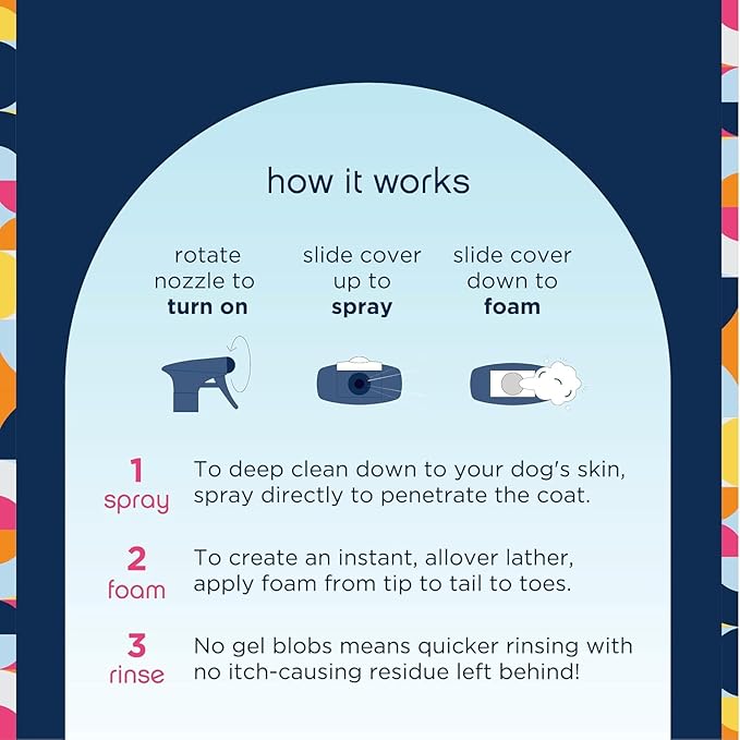 - TWO WAYS TO CLEAN YOUR PUP: Our innovative dual-action nozzle makes bath time super easy. Use the direct spray option to penetrate your pup's coat and reach the skin, then use the foamer to create an instant all-over lather. When it's time to rinse, our formula washes away quickly without leaving behind any itch-causing residue!