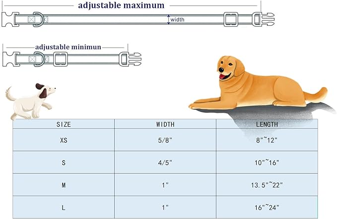 - SIZE: XS Collar (Width : 5/8"Length : 8-12"). S Collar (Width : 4/5" Length : 10-16"). M Collar (Width : 1" Length : 12-22"). L Collar (Width : 1" Length : 16-24").