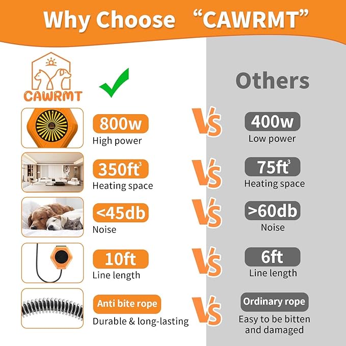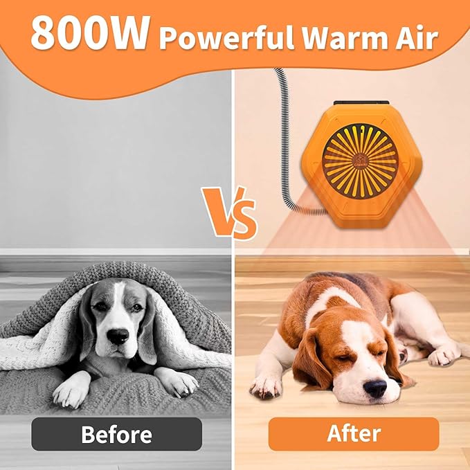 - 800W Heater for Pet Houses & Chicken Coops: Powerful heaters can easily cover Spaces of 100 ft³ and above(depending on the airtightness of the room.)making it suitable for most dog houses.