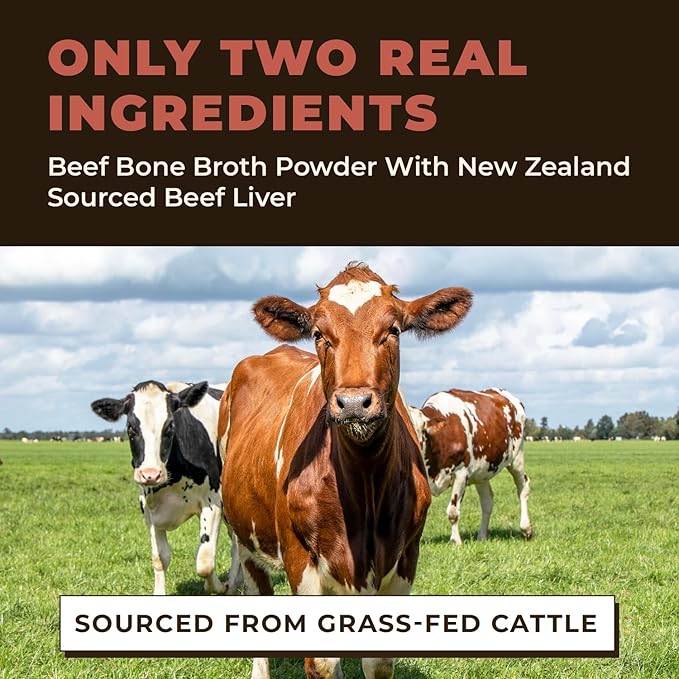 - SOURCE MATTERS: Made with only two high-quality human grade ingredients: Grass fed beef bone broth powder from North America and beef liver from grass fed, pasture raised bovine from New Zealand, ensuring a natural and wholesome supplement for your pets.