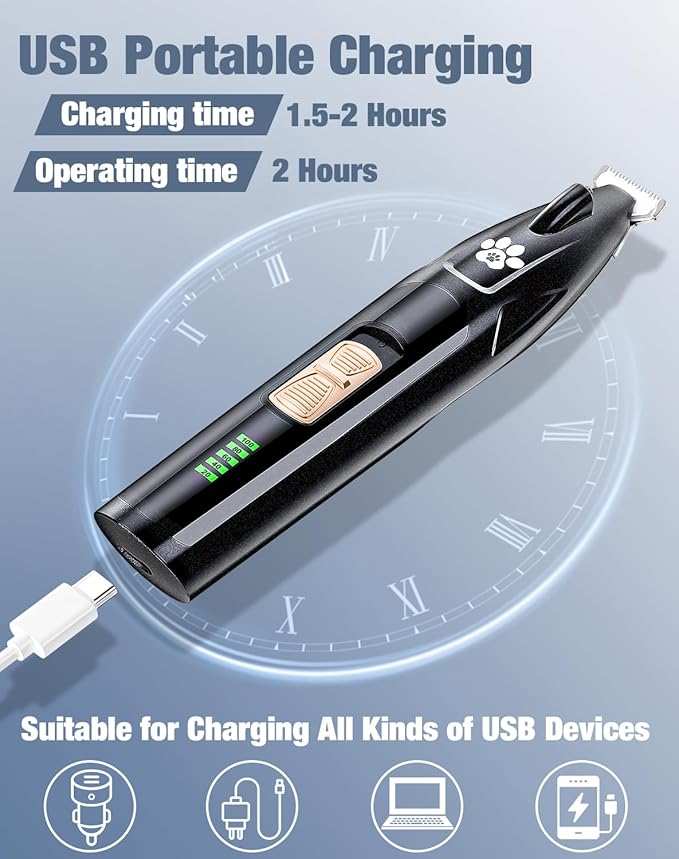- LED DISPLAY & LED LIGHT - This dog paw trimmer is designed with LED display keeps you informed of the dog grooming clipper's remaining power status. LED light illuminates small areas, making it easier to see and trim your pet's fur with accuracy