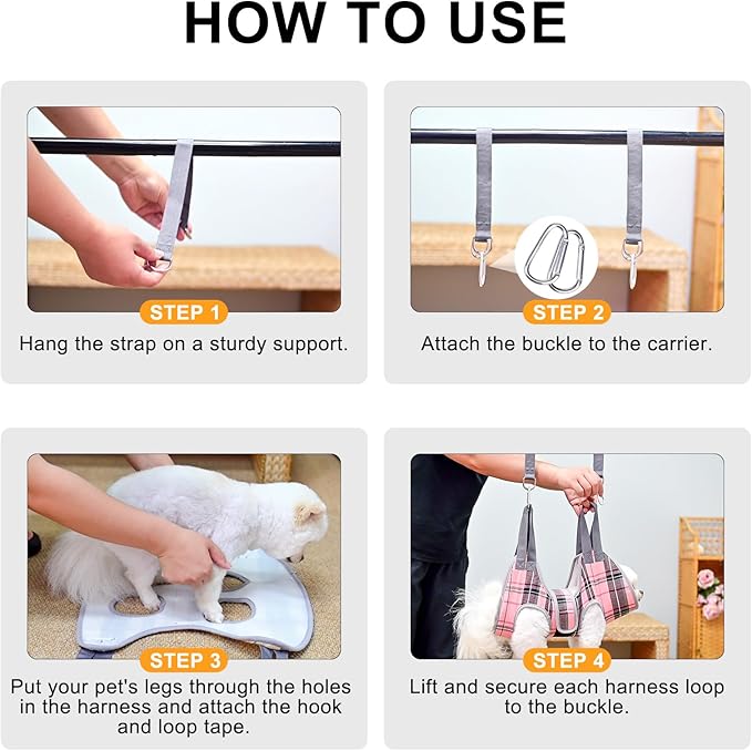 - Professional Dog Grooming Kit- The dog grooming harness set includes sturdy, thickened, and extra strong carabiners x2, dog nail clippers with safety device design x1, file x1, steel comb x1, and webbing tapes for irregular bars or bars that are too thick x2. Clipping nails, trimming hair, applying topicals and grooming at home is easy with this kit