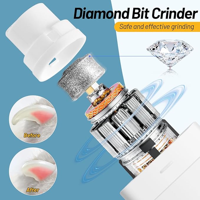 - 【Safe and Efficient Trimming】: This dog nail trimmers uses high-quality diamond roller drill bits, which have excellent grinding effects. It can also trim pet nails accurately, quickly, and smoothly, and reduce the risk of nail damage. The built-in UV light at the bottom helps you quickly discover the details of the pet's nails and effectively clean them while trimming.