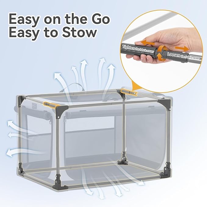 - Our portable dog crate features a patented spiral head design that allows you to adjust the tightness of the cloth cover, accommodating slight production variances and multiple washes. This ensures compatibility and a perfect fit. Simply unfold the product, secure the frame, and twist the spiral tubes to complete setup.