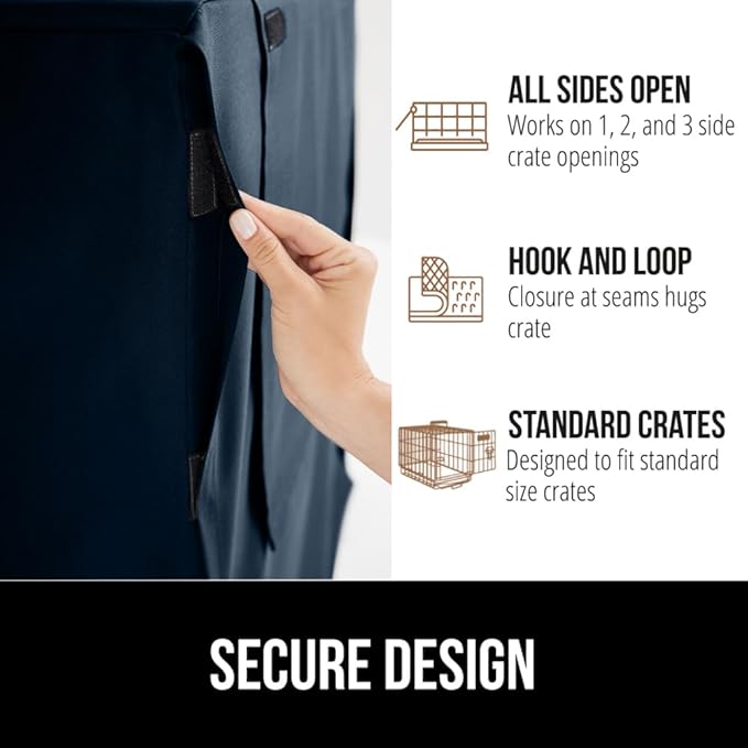 - STAYS IN PLACE: hook and loop fasteners at seams close crate cover; additional hook at loop fastener at the bottom corners help secure cover to crate; cover sizing aligns with standard size crates