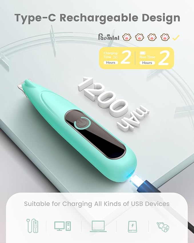 - TYPE-C Rechargeable & Easy-To-Grip Design: Battery capacity is larger at 1200 mAh, which is equivalent to a full body shaver. It can be used for two hours after a full charge. Advanced anti-slip design on the back makes it easier to hold and prevents pets from getting scratched due to improper force while shaving. Very beginner friendly