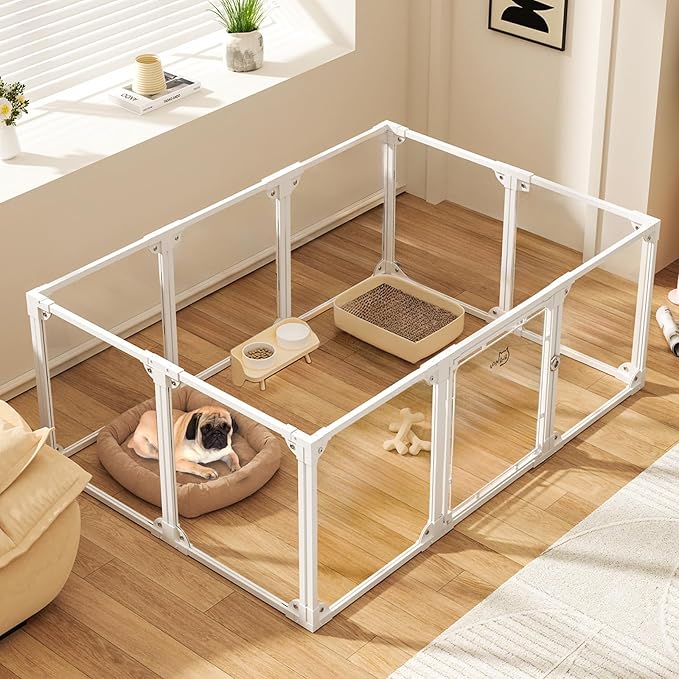 - 【Sturdy, Durable, and Stylish】The dog play pen combines square tube aluminum alloy and acrylic for superior stability. Its modern design complements any décor style, adding elegance to your home.