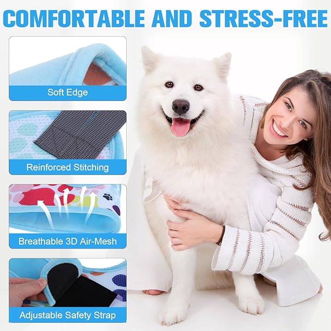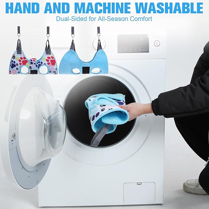 - COMFORTABLE AND WASHABLE: Soft material with thickened edges makes this pet grooming sling increase comfort and sturdiness. In addition, dog restraint grooming bag has an upgraded wider under body support and larger frontal chest/neck space. And our heavy-duty carabiners with better weight bearing. Our dog harness for nail trimming can be machine washed