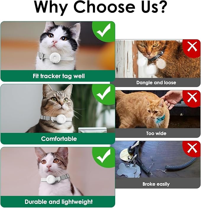 - â€ăSecure Cat SafetyăOur cat tracker collar is designed to fit most of cats, adjusted from "7.87- 13". Cat collar tracker comes with little bell,the sound of cute bell makes it easy to see where your cat is.Breakaway buckle ensures quick release cat neck for emergencies,while the reflective strips improved visibility,ensuring the safety of your cat at night and preventing accidents.A cat collar with tracker can provide pet owners with peace of mind.