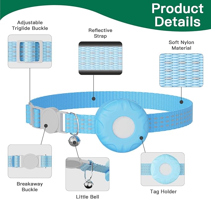 - â€ăSecure Cat SafetyăOur cat tracker collar is designed to fit most of cats, adjusted from "7.87- 13". Cat collar tracker comes with little bell,the sound of cute bell makes it easy to see where your cat is.Breakaway buckle ensures quick release cat neck for emergencies,while the reflective strips improved visibility,ensuring the safety of your cat at night and preventing accidents.A cat collar with tracker can provide pet owners with peace of mind.