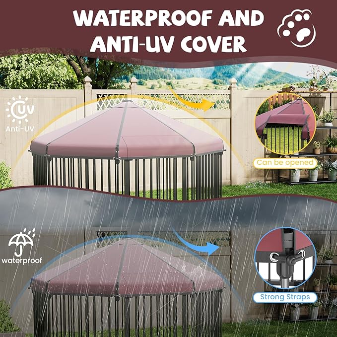 - [UNIQUE OCTAGON DESIGN FOR STABILITY] Discover the benefits of our Octagon dog kennel, featuring a unique Octagon design that enhances stability and safety for your pet. The thoughtful shape minimizes the risk of tipping while providing ample space for your furry friend to play and relax. This innovative design not only promotes a secure environment but also allows for better airflow and visibility, ensuring your dog feels comfortable and at ease in their outdoor space.