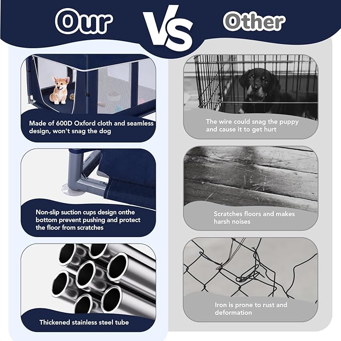 - EXCELLENT MATERIAL - Our puppy play pen indoor is made of wear-resistant 600D Oxford cloth, breathable and visible mesh and thickened stainless pipe. It provide a sturdy and safe environment for small dogs, small animals.