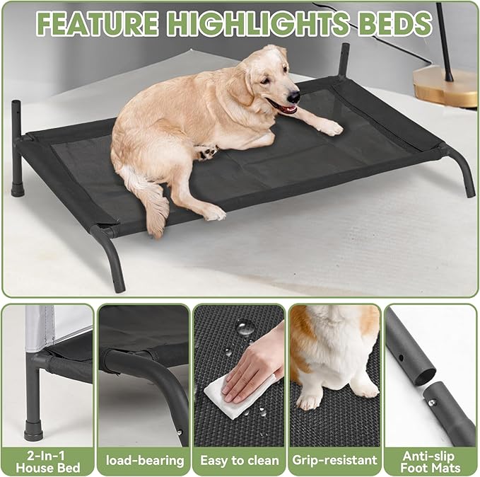 - Large Elevated Raised Outdoor Dog Bed House - The elevated dog house shelter keeps your pet off the hot or cold, damp ground, reducing the strain on their joints and muscles. The breathable rip-stop 2X1 mesh ensuring your pet stays cool in the summer while dry and protected from the elements in the winter.