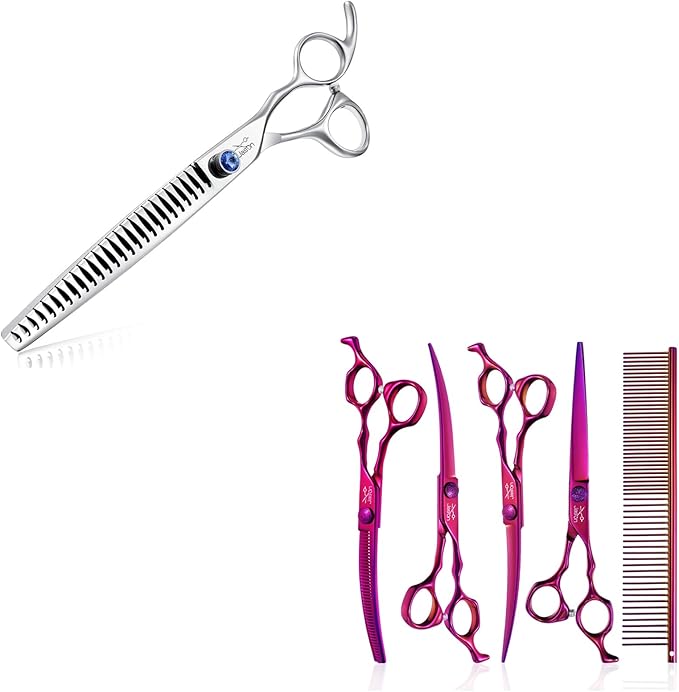- 6 in 1 Scissors Set: This grooming set includes: 7" Up-Curved Scissor, 7" Down-Curved Scissor, 7" Curved Thinner, 7" Straight Scissor, and a Grooming Comb. Perfect for both professional and home dog grooming use, this shears set provides a complete grooming experience. Crafted from solid, rust-resistant Japanese premium stainless steel, this grooming scissors set has a longer service life