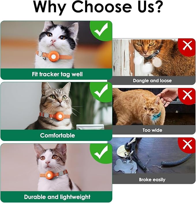 - â€ăSecure Cat SafetyăOur cat tracker collar is designed to fit most of cats, adjusted from "7.87- 13". Cat collar tracker comes with little bell,the sound of cute bell makes it easy to see where your cat is.Breakaway buckle ensures quick release cat neck for emergencies,while the reflective strips improved visibility,ensuring the safety of your cat at night and preventing accidents.A cat collar with tracker can provide pet owners with peace of mind.