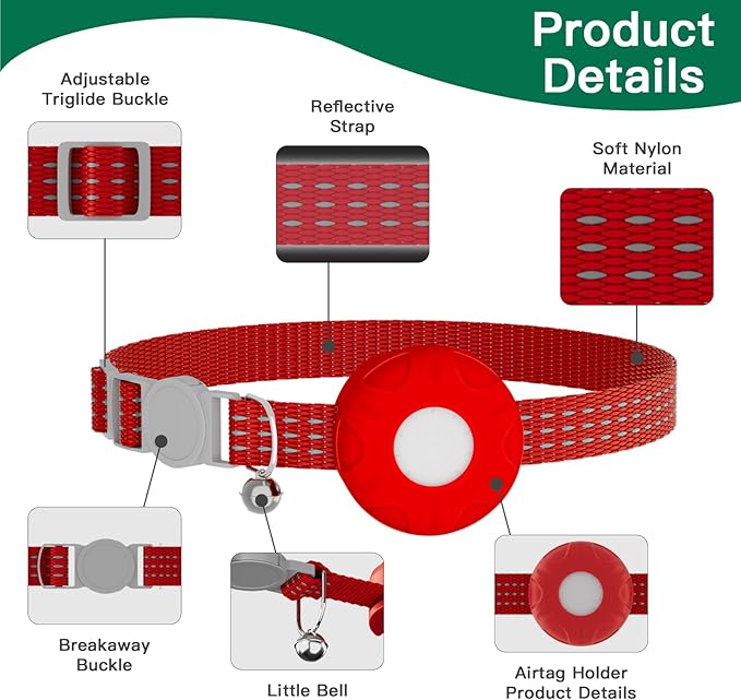 Cat Tracker Collar,No Monthly Fee Tracking Pet Collar with Finder Tag,Compatible with Apple Find My(iOS Only),Breakaway Tractive Design with Reflective Pattern & Bell,Red