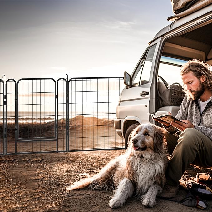 - 【Sturdy Metal Construction】--The dog playpen is constructed from sturdy iron material with a rust-resistant coating, anti-rust, anti-corrosion, waterproof and UV resistant, which makes it ideal for RV camping, traveling, or for use in the yard.