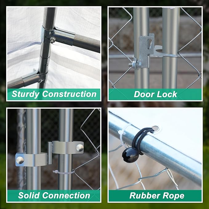 - 【Heavy Duty & Weather-Resistant Construction】This outdoor dog kennel features a galvanized metal frame that helps resist rust and corrosion, making it suitable for long-term outdoor use. The reinforced design, combined with secure cable ties and ground nails, enhances the stability of the dog crate—even for active large dogs. A solid option for outdoor protection in various weather conditions