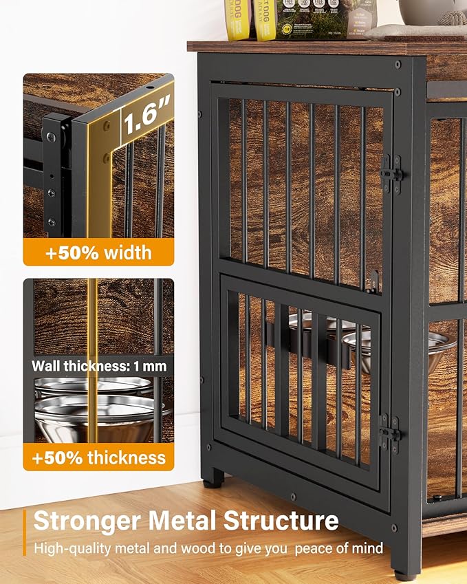 - Thickened Tubes & Multi-Lock Design: Our dog kennel for indoor is crafted from thickened metal and wood. The indestructible steel tubes with a wall thickness of 1 mm provides excellent chewing resistance. Dual security locks on both the front and side doors, located above and below the doors, enhance the reliability of futniture dog crate compared to the single security lock design